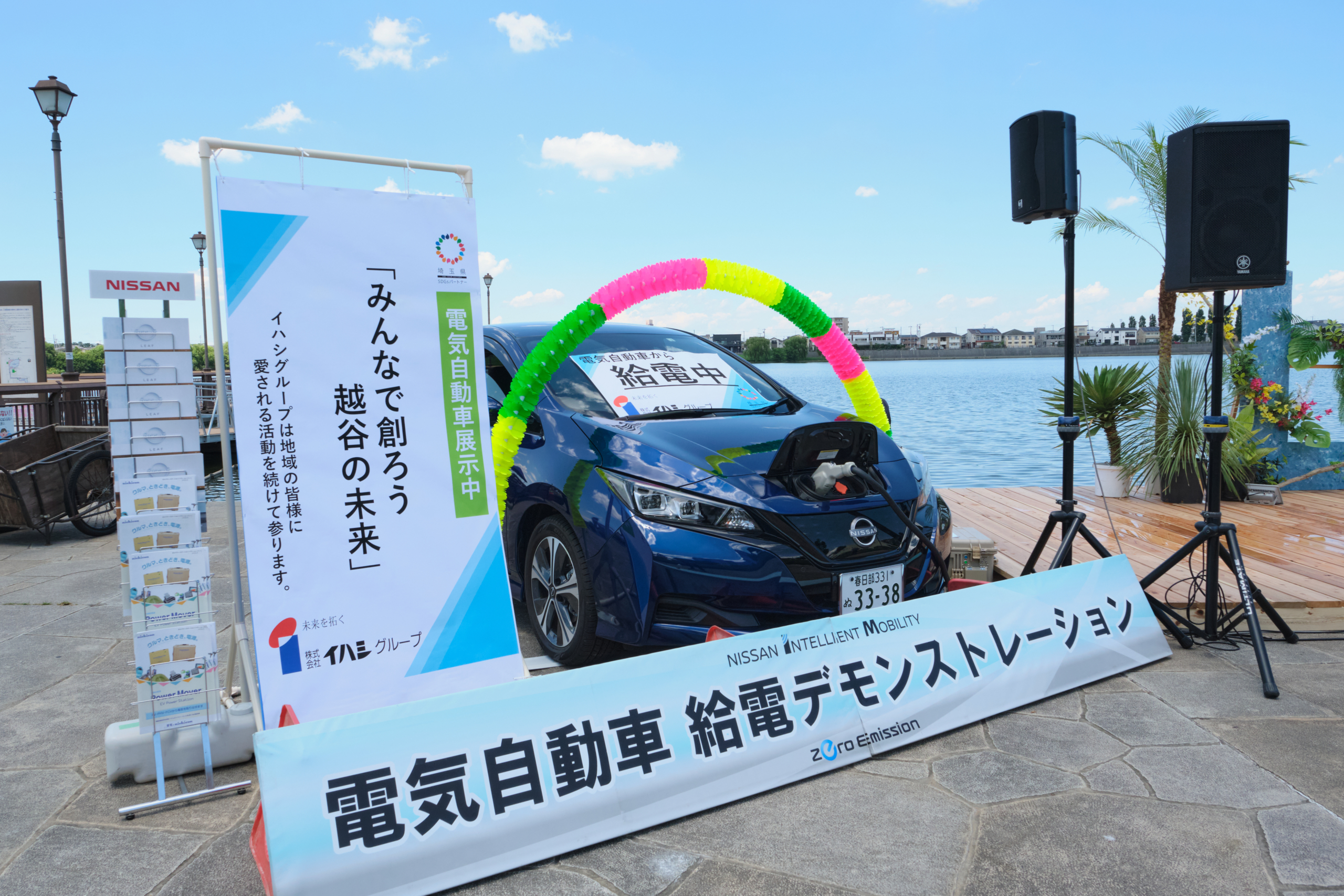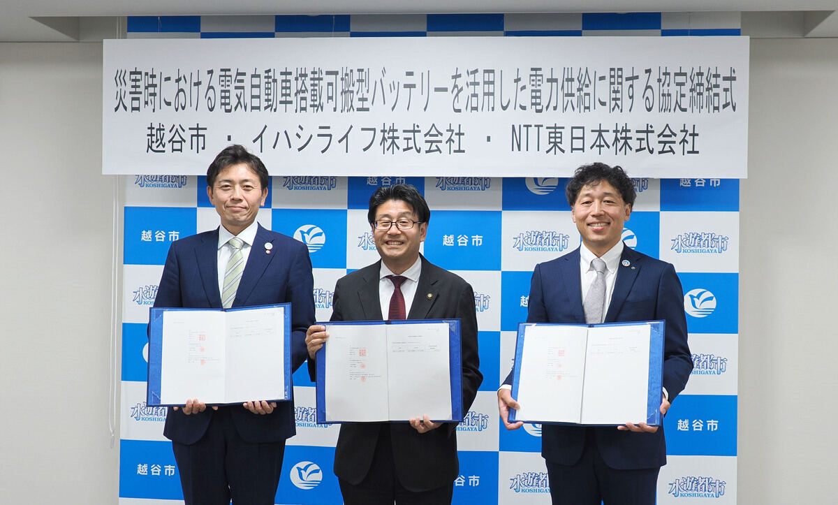 越谷市と民間事業者など10者は2024年7月、市民、事業者、行政が一体になり脱炭素に取り組む「こしがや脱炭素コンソーシアム」を設立。コンソーシアムで検討する取り組みの一つとして、越谷市、イハシライフ、NTT東日本は、「災害時における電気自動車搭載可搬型バッテリーを活用した電力供給に関する協定」を締結した。災害時に電力が不足した場合、大相模中学校に設置した太陽光発電設備を活用して可搬型バッテリーに充電を行い、避難所の電力を確保することが可能となる。また同社独自の取り組みとして、市内小中学校に設置してある自立運転型冷暖房GHP(ガスヒートポンプ)のうち3校にガスを供給しており、災害時の電力供給も可能となる。